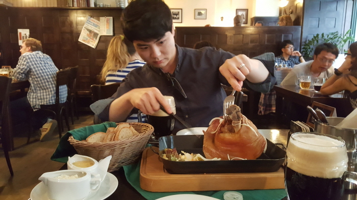 그리고 여행에 먹거리가 빠질 순 없겠죠?! 앞서 말씀드렸지만 호텔에서 먹은 조식이 너무 든든해서 배가 꺼지질 않더라구요... 그래서 생각보다 많이 먹지는 않았습니다. 하지만 체코에서 유명한것이 물보다 싼 맥주와 꼴레뇨라고 하기에 꼴레뇨가 유명한 식당에서 코젤 흑맥주와 꼴레뇨를 먹었답니다. 돼지 무릎요리인데 한국으로 치면 족발이에요. 그런데 무슨 돼지 무릎에 살이 많은지 2명이서 결국 다 못먹고 나왔답니다. (참고로 저 피자2판 혼자 먹는 남자)