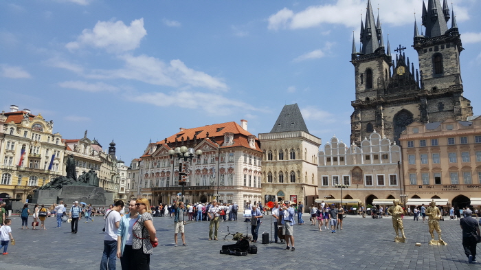밖으로 나와 처음으로 보는 유럽풍경에 한동안 감탄사만 연발하였습니다. 무슨 에버랜드 동화나라에 있는 듯한 벅찬 감동에 정말 눈물까지 나오더라구요. 위 사진은 바츨라프 광장과 구시가지광장 모습입니다. 많은 사람들이 몰려있었고 특히 매 정시간마다 천문시계탑을 보러오는 많은 인파들로 북적거리는 구시가지 광장이었습니다.